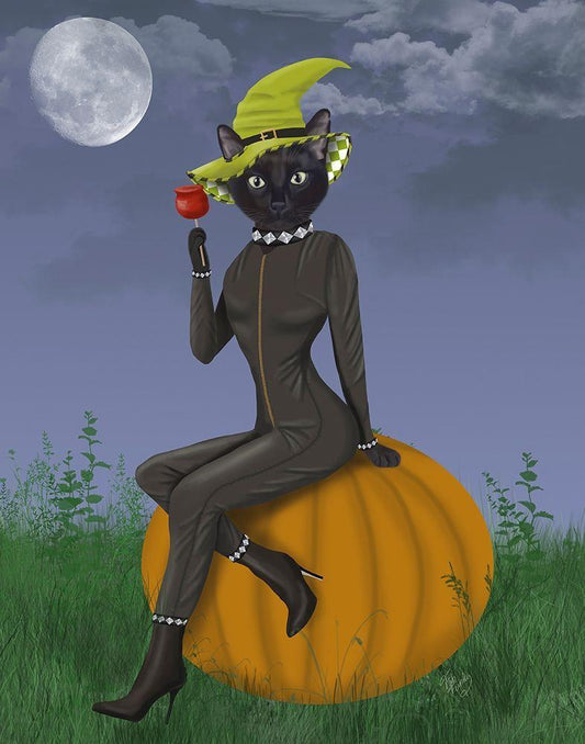 Halloween Black Cat in Pumpkin White Modern Wood Framed Art Print with Double Matting by Fab Funky