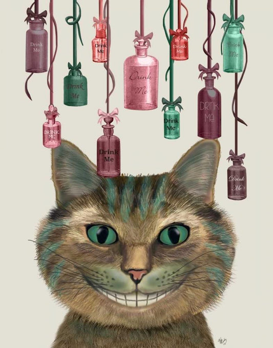 Cheshire Cat and Bottles White Modern Wood Framed Art Print with Double Matting by Fab Funky
