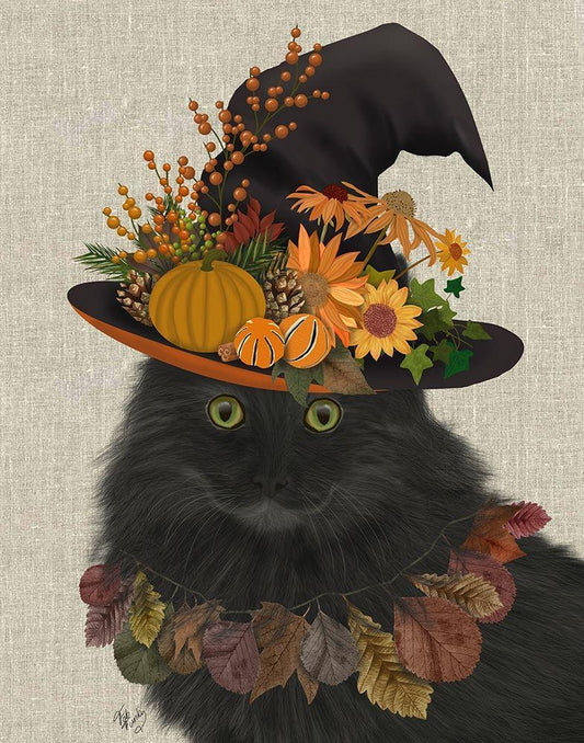 Black Cat with Autumn Hat, Portrait White Modern Wood Framed Art Print with Double Matting by Fab Funky