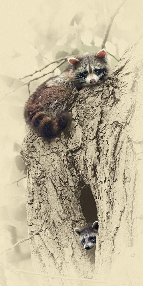 Mom And Baby Raccoon White Modern Wood Framed Art Print with Double Matting by Brown, Jim