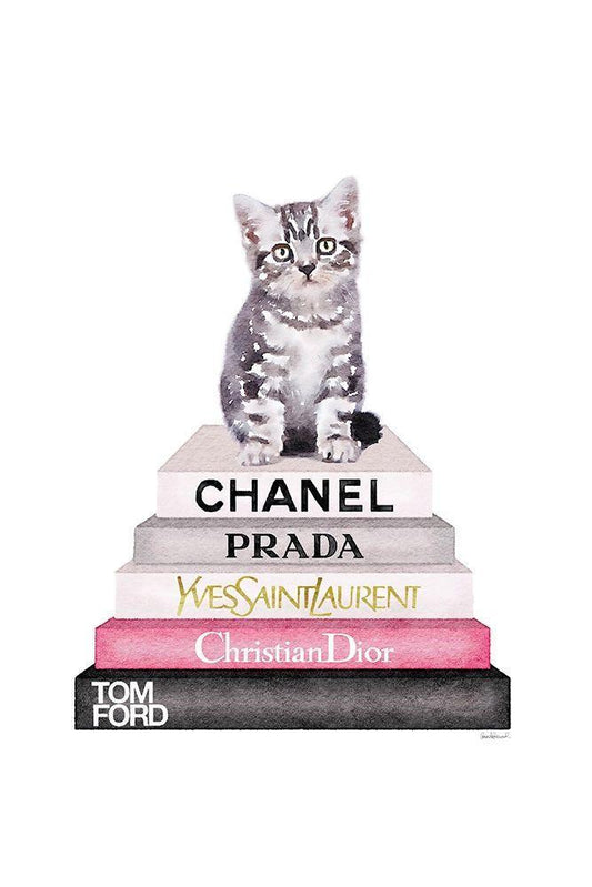 Kitten Bookstack White Modern Wood Framed Art Print with Double Matting by Greenwood, Amanda