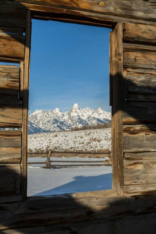 WY, Grand Tetons Mountains through cabin doorway White Modern Wood Framed Art Print with Double Matting by Illg, Cathy and Gordon