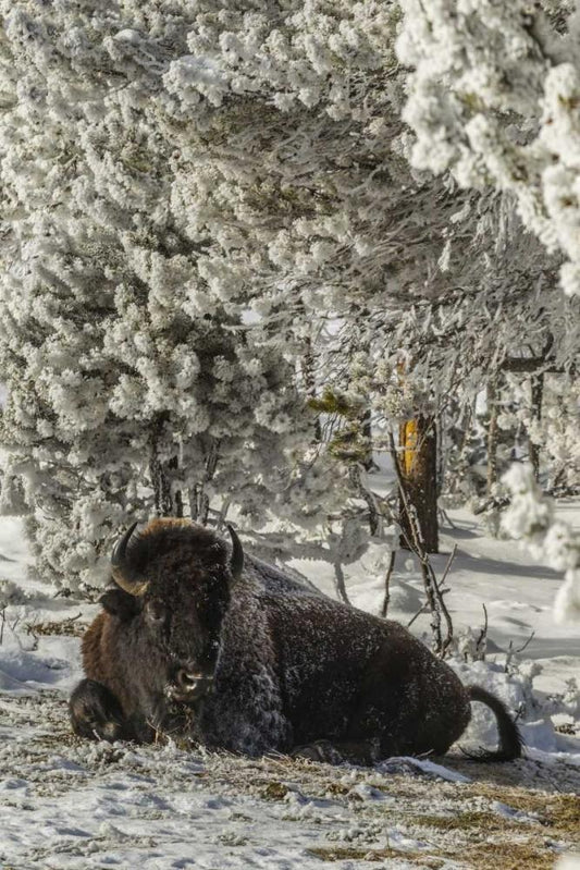 WY, Yellowstone Bison resting on snowy ground White Modern Wood Framed Art Print with Double Matting by Illg, Cathy and Gordon