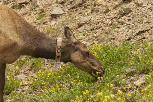 CO, Rocky Mts Elk cow with collar eating flowers White Modern Wood Framed Art Print with Double Matting by Illg, Cathy and Gordon