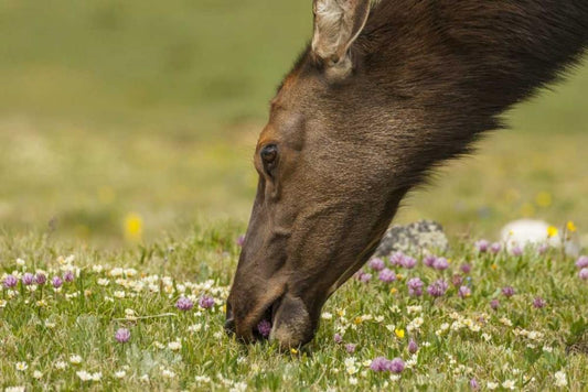 Colorado, Rocky Mountains Elk cow eating flowers White Modern Wood Framed Art Print with Double Matting by Illg, Cathy and Gordon