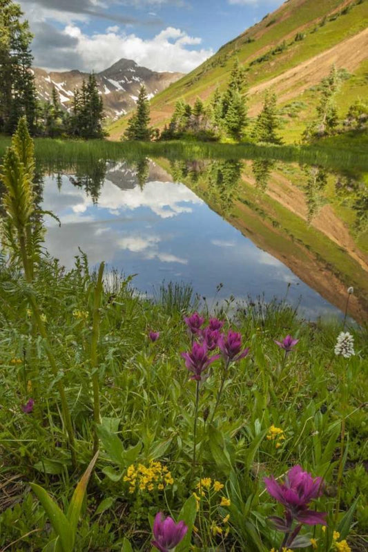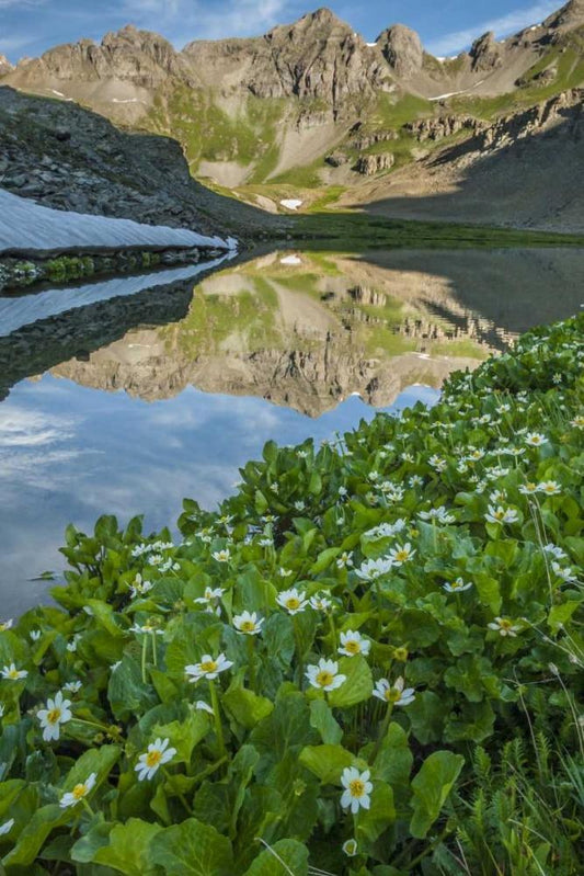 CO, San Juan Mts Lake reflection and marigolds White Modern Wood Framed Art Print with Double Matting by Illg, Cathy and Gordon