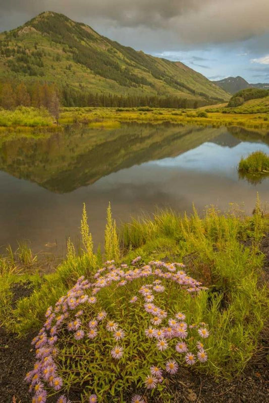 CO, Gunnison NF Asters and pond White Modern Wood Framed Art Print with Double Matting by Illg, Cathy and Gordon