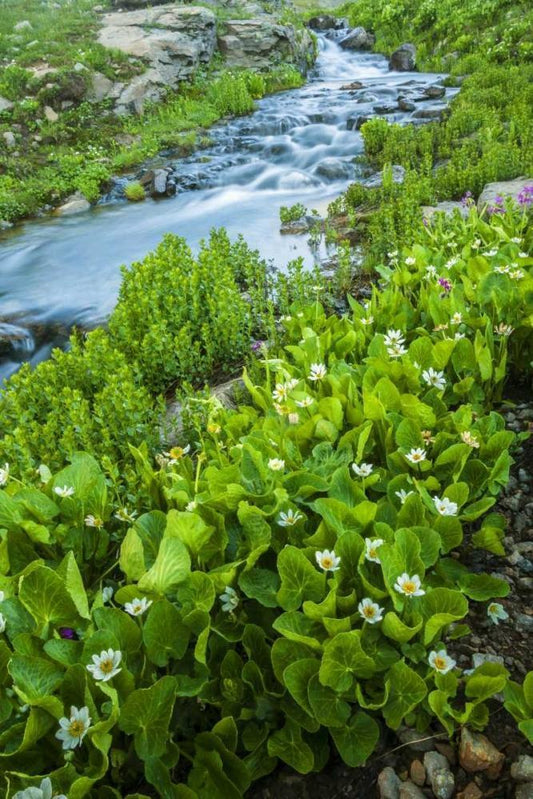 CO, San Juan Mts Stream and spring marigolds White Modern Wood Framed Art Print with Double Matting by Illg, Cathy and Gordon