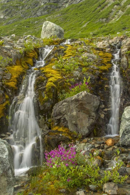 Alaska, Glacier Bay NP Fireweed and waterfall White Modern Wood Framed Art Print with Double Matting by Illg, Cathy and Gordon