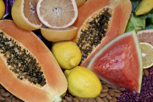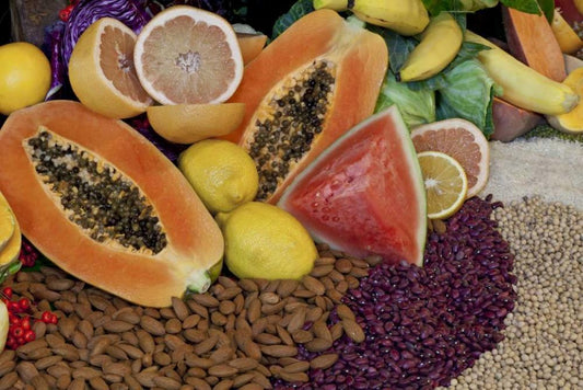 Mexico, Tecate Display of fruit, nuts and grains White Modern Wood Framed Art Print with Double Matting by Paulson, Don