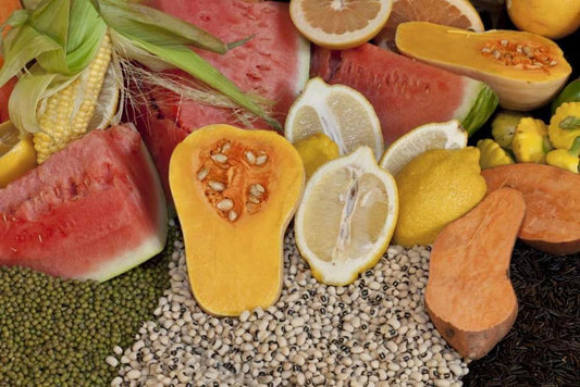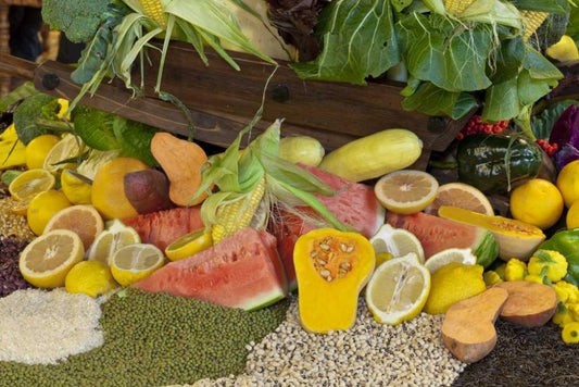Mexico, Tecate Display of fruit and grains White Modern Wood Framed Art Print with Double Matting by Paulson, Don