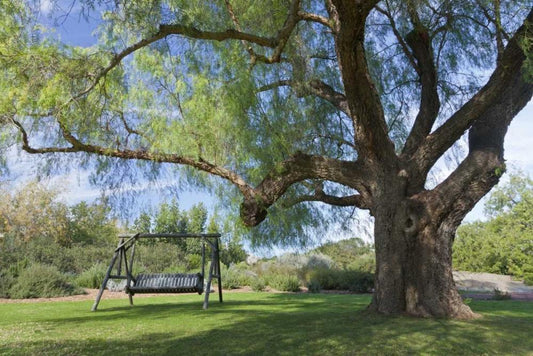 Mexico, Tecate Bench swing under large tree White Modern Wood Framed Art Print with Double Matting by Paulson, Don