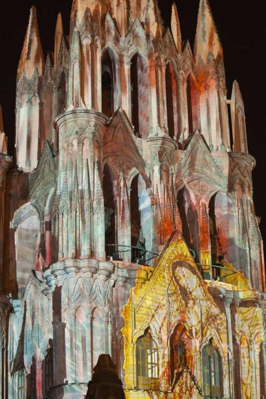 Mexico Light show on La Parroquia cathedral White Modern Wood Framed Art Print with Double Matting by Paulson, Don