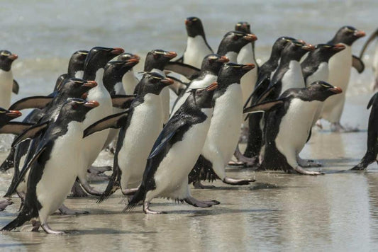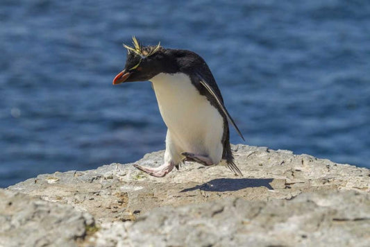 Bleaker Island Rockhopper penguin hopping White Modern Wood Framed Art Print with Double Matting by Illg, Cathy and Gordon