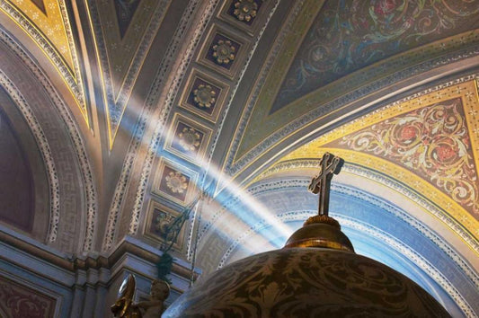 Mexico, Morelia Rays into Roman Catholic church White Modern Wood Framed Art Print with Double Matting by Rotenberg, Nancy