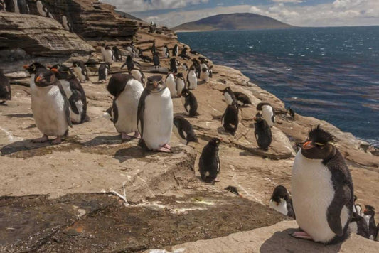 Saunders Island Rockhopper penguins on cliff White Modern Wood Framed Art Print with Double Matting by Illg, Cathy and Gordon