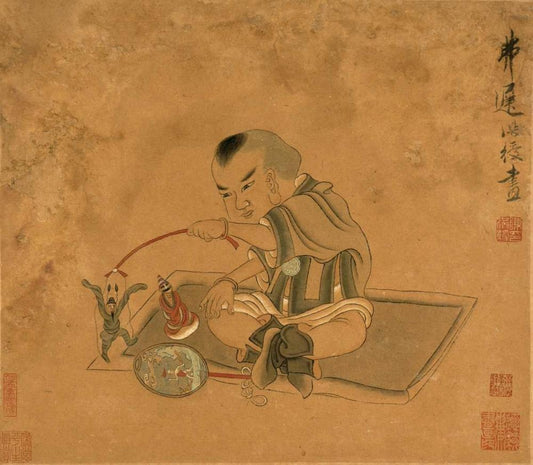 A Child Playing With Marionettes White Modern Wood Framed Art Print with Double Matting by Hongshou, Chen
