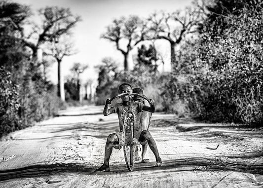 Having Fun Among Baobabs White Modern Wood Framed Art Print with Double Matting by Tagliarino, Marco