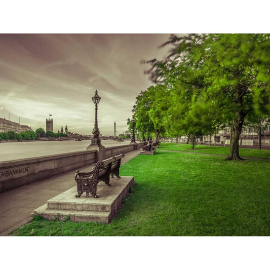 Benchs by the walkway next to river thames, London, Uk Black Modern Wood Framed Art Print with Double Matting by Frank, Assaf