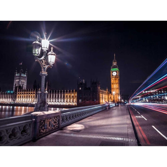 Westminster Bridge on river Thames with strip lights, London, UK Black Modern Wood Framed Art Print with Double Matting by Frank, Assaf