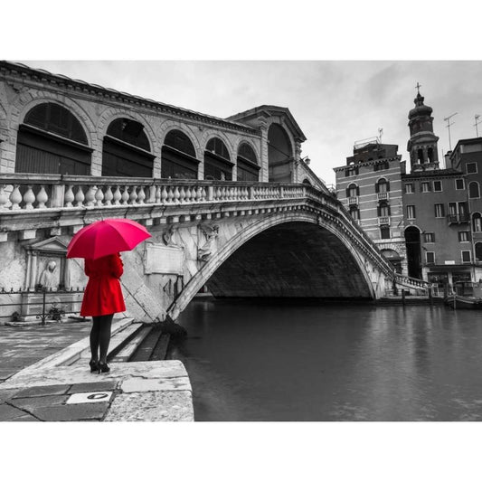 A woman in a red dress holding red umbrella and standing next to the Rialto bridge, Venice, Italy Black Modern Wood Framed Art Print with Double Matting by Frank, Assaf