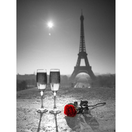 Champagne glasses with red rose next to the Eiffel tower Black Modern Wood Framed Art Print with Double Matting by Frank, Assaf