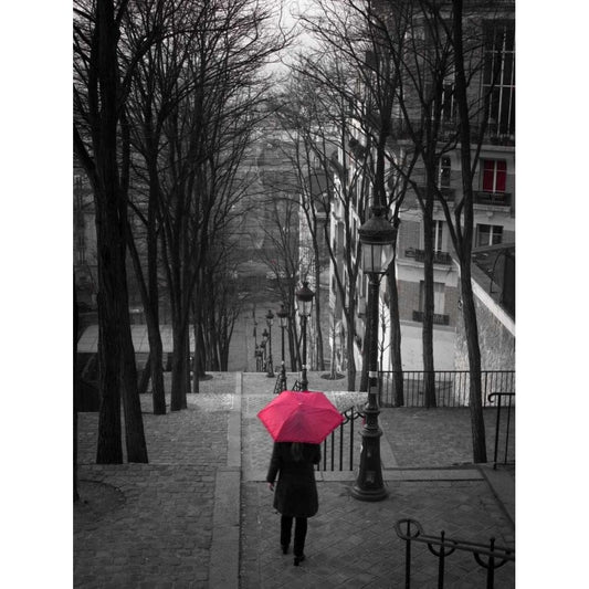 Woman with red umbrella standing on staircase in Montmartre, Paris, France Black Modern Wood Framed Art Print with Double Matting by Frank, Assaf