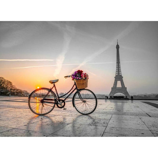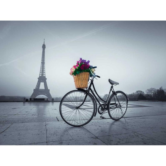 A bicycle with a basket of flowers with the Eiffel tower in the background Black Modern Wood Framed Art Print with Double Matting by Frank, Assaf