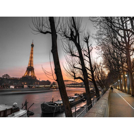 Row of trees, the river Seine and the Eiffel tower at dusk Black Modern Wood Framed Art Print with Double Matting by Frank, Assaf