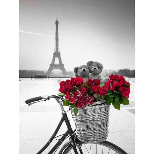 Teddy Bears and bunch of red roses on bicycle with Eiffel tower in the background Black Modern Wood Framed Art Print with Double Matting by Frank, Assaf