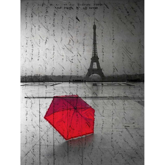 Red umbrella in front of the Eiffel tower with handwritting overlay Black Modern Wood Framed Art Print with Double Matting by Frank, Assaf