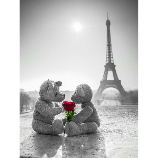 Two Teddy bears with a rose next to the Eiffel tower Black Modern Wood Framed Art Print with Double Matting by Frank, Assaf