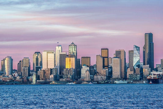 Washington State-Seattle Skyline at Sunset White Modern Wood Framed Art Print with Double Matting by Tilley, Rob