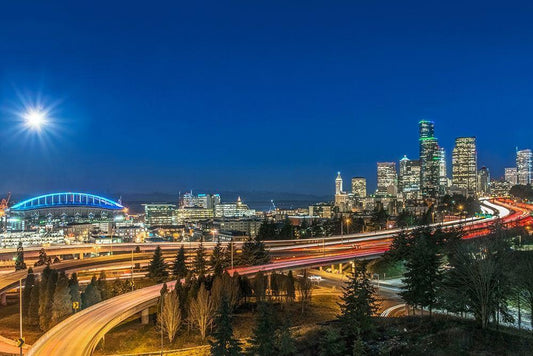 Washington State-Seattle Full Moon Over Downtown White Modern Wood Framed Art Print with Double Matting by Tilley, Rob