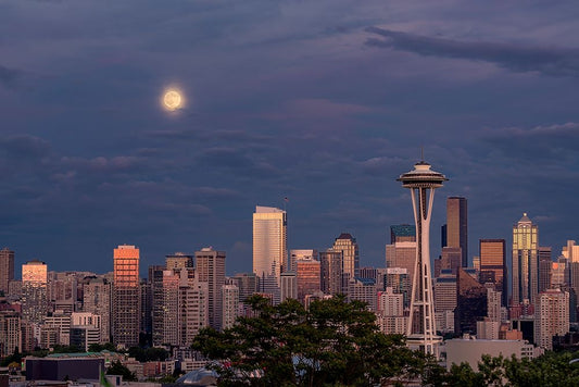 Downtown Seattle with a full moon rising in the evening sky-Seattle-Washington State White Modern Wood Framed Art Print with Double Matting by Probst, Greg