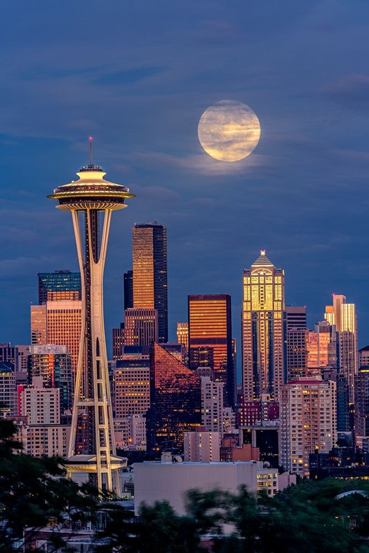 Seattle skyline and super moon at dusk-Seattle-Washington State White Modern Wood Framed Art Print with Double Matting by Jones, Adam