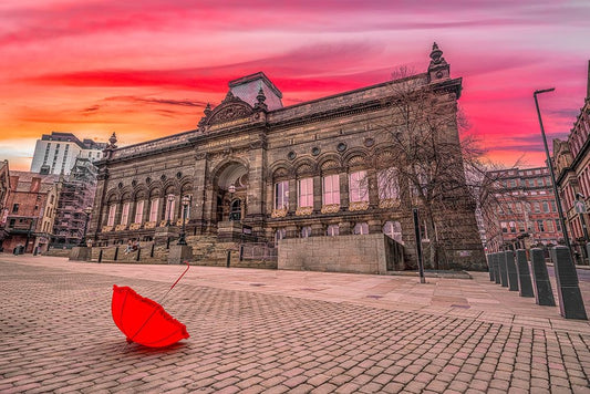 Red umbrella outside-city museum White Modern Wood Framed Art Print with Double Matting by Frank, Assaf