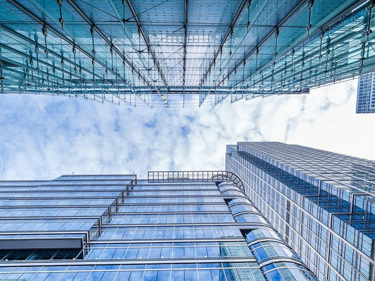 Low angle view of skyscrapers White Modern Wood Framed Art Print with Double Matting by Frank, Assaf