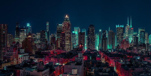 New York cityscape at night White Modern Wood Framed Art Print with Double Matting by Frank, Assaf