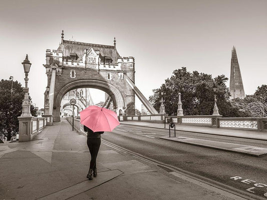 Lady with a pink umbrella, Tower bridge, London White Modern Wood Framed Art Print with Double Matting by Frank, Assaf