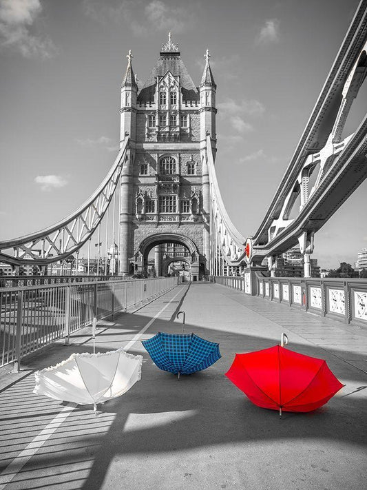 Colorful umbrellas on Tower bridge, London, UK White Modern Wood Framed Art Print with Double Matting by Frank, Assaf