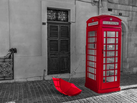 Red umbrella and Telephone box on street of Marsaxlokk, Malta White Modern Wood Framed Art Print with Double Matting by Frank, Assaf