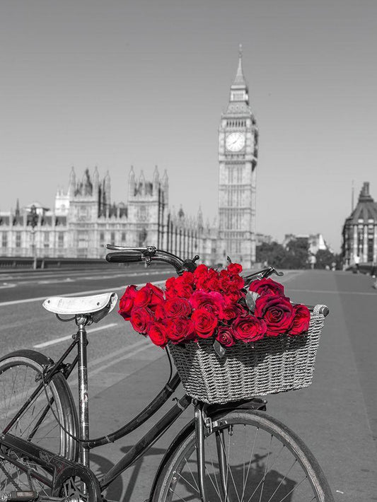 Bunch of Roses on a bicycle agaisnt Westminster Abby, London, UK White Modern Wood Framed Art Print with Double Matting by Frank, Assaf