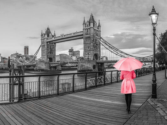 Lady in pink, Tower bridge, London White Modern Wood Framed Art Print with Double Matting by Frank, Assaf