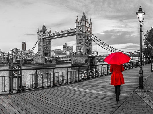 Tourist with red umbrella on promenade near Tower bridge, London, UK White Modern Wood Framed Art Print with Double Matting by Frank, Assaf