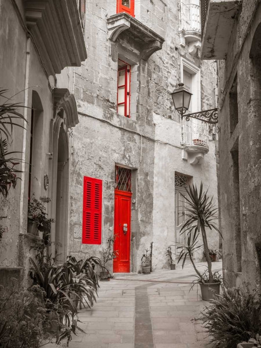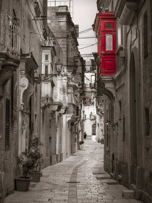 Narrow street through traditional maltese houses in Birgu, Malta White Modern Wood Framed Art Print with Double Matting by Frank, Assaf