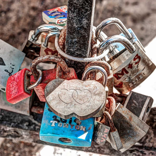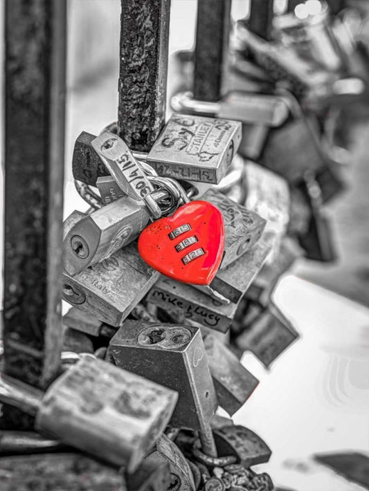 Love padlocks on bridge railing, St Julians, Malta White Modern Wood Framed Art Print with Double Matting by Frank, Assaf