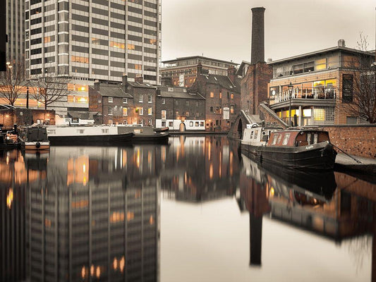 Narrow canal with small boats in Birmingham, UK White Modern Wood Framed Art Print with Double Matting by Frank, Assaf