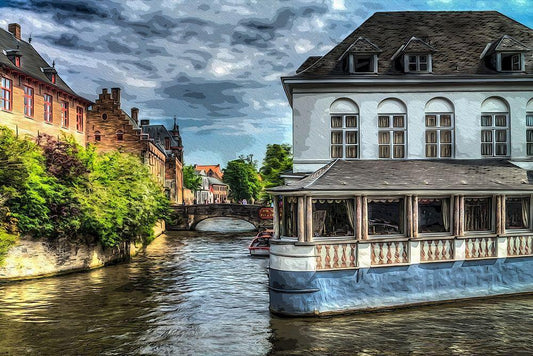 Brugges Canal White Modern Wood Framed Art Print with Double Matting by Bolokofsky, Ronald
