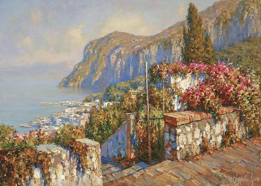 Portofino-Flowers above the Sea White Modern Wood Framed Art Print with Double Matting by Obuchovsky, Yury